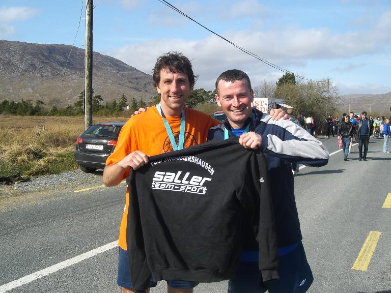 ... über die - allerdings noch nie von einem TuS-Mitglied gelaufene - Halbmarathon-Strecke von 21 Kilometer hat Gunther Sandtner (Foto, l.) gesorgt. Das Mitglied der Meistermannschaft 2005 benötigte in seiner irischen Wahlheimat 1:50:37 Stunden. Dazu der Athlet: "Mit meiner Zeit bin ich mehr als zufrieden, wenn man mal das Streckenprofil mit in Betracht zieht. Die zwei bösen langen Anstiege waren heftig, besonders der zweite acht Kilometer vor Schluss." Einer besseren Zeit stand, so der Ausdauersportler, ein "unnötiger Ballast von zwei Kilogramm" entgegen, der mit einem fehlgeschlagenen Toilettengang am Morgen zusammen hing. Sein Fazit nach dem Lauf: "Bin jetzt fit für die A-Liga! A-Liga? Was war eigentlich in Hadamar II los???" Die Partie hatten die Grün-Weißen mit 0:2 verloren.